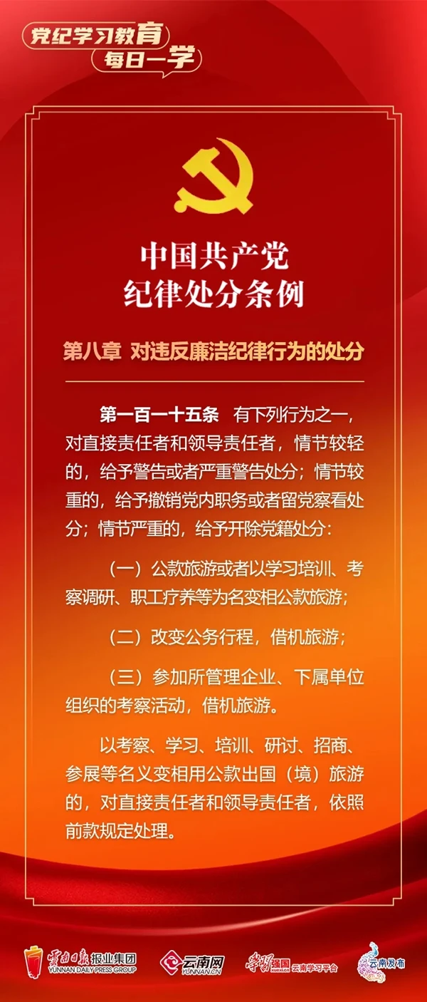 為深入學(xué)習(xí)貫徹落實(shí)習(xí)近平總書記關(guān)于黨紀(jì)學(xué)習(xí)教育的重要講話和重要指示精神,便于全省各級(jí)黨組織和廣大黨員、干部深入學(xué)習(xí)貫徹修訂后的《中國(guó)共產(chǎn)黨紀(jì)律處分條例》,云南網(wǎng)聯(lián)合“學(xué)習(xí)強(qiáng)國(guó)”云南學(xué)習(xí)平臺(tái)、云南發(fā)布共同策劃推出“黨紀(jì)學(xué)習(xí)教育•每日一學(xué)”專欄,營(yíng)造全員參與、人人學(xué)紀(jì)的濃厚氛圍。今天,我們推出第55期,一起來學(xué)習(xí)。