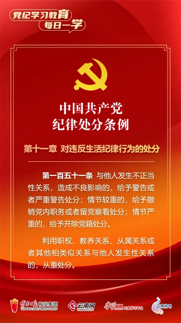 為深入學(xué)習(xí)貫徹落實習(xí)近平總書記關(guān)于黨紀(jì)學(xué)習(xí)教育的重要講話和重要指示精神,便于全省各級黨組織和廣大黨員、干部深入學(xué)習(xí)貫徹修訂后的《中國共產(chǎn)黨紀(jì)律處分條例》,云南網(wǎng)聯(lián)合“學(xué)習(xí)強(qiáng)國”云南學(xué)習(xí)平臺、云南發(fā)布共同策劃推出“黨紀(jì)學(xué)習(xí)教育•每日一學(xué)”專欄,營造全員參與、人人學(xué)紀(jì)的濃厚氛圍。今天,我們推出第72期,一起來學(xué)習(xí)。