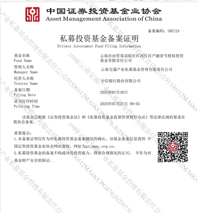 7月30日,基金公司受托管理、募集設(shè)立的首支市場化私募股權(quán)投資基金——云南自由貿(mào)易試驗(yàn)區(qū)紅河片區(qū)產(chǎn)融壹號股權(quán)投資基金有限責(zé)任公司在中基協(xié)備案成功(備案編碼:SBCU24)。