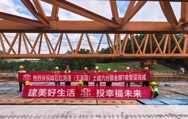 同日,峨石紅高速(玉溪段)土建六分部完成全部T梁架設(shè)任務(wù),實現(xiàn)主線貫通。